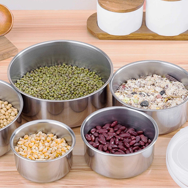 1.A set of 5 stainless steel fresh-keeping boxes. Round sealed bowls with lids.
